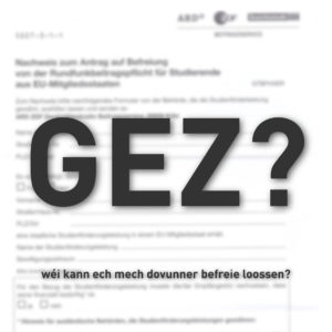 No ville positive Réckmeldungen dass d’Befreiung vun der GEZ geklappt huet, wëlle mer hei nach eemol genau drop agoe wei eng Schrëtt ze ënnerhuele si fir befreit ze ginn. Et bleift am Moment dobäi dass eng Befreiung just fir déi Studente méiglech ass déi eng Bourse Sociale kréien.