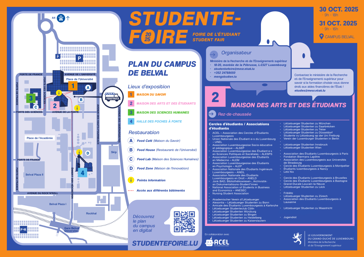 Op der Studentefoire informéiert d’ACEL zesummen mam Ministère fir Fuerschung an Héichschoul zanter 40 Joer iwwert de Studium, d’Universitéitsliewen an alles waat dozou gehéiert. Jiddereen ass wëllkomm, sech iwwert hier Zukunft ze informéieren!